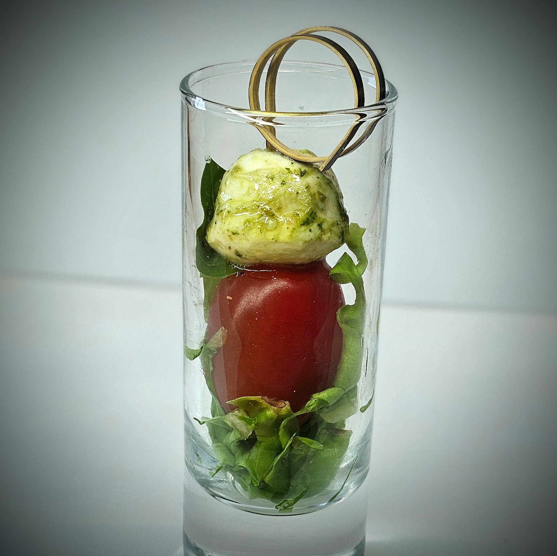 špíz s cherry rajčátky a mozzarellou, bazalkové pesto